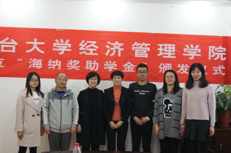 2016-2017年度校友“海纳助学金”的决定》。紧接着,李育华、赵卉妍为受资助学生李春霞、秦景顺颁发证书,学生代表秦景顺在随后的发言中表示:“‘海纳助学金’的设立让他深深感受到了校友们的温暖和对自己的殷切希望,他要把感恩之心转化为刻苦学习的强大动力,学成后不忘回报学校,回报社会。”他的独到见解博得在场同学的阵阵掌声。随后,李育华代表校友讲话,她表示将大爱传承,是烟大人步入社会的使命,通过自身的努力让母校充满荣光是每一个烟大人的责任。颁奖仪式的最后,与会嘉宾领导以及获奖学生合影留念。